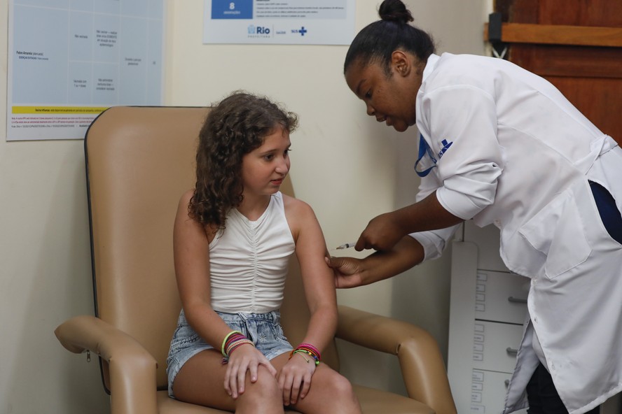 Carolina Alves Neves,10 anos,recebe vacina contra a dengue,que não pode ser aplicada em crianças imunossuprimidas — Foto: Guito Moreto
