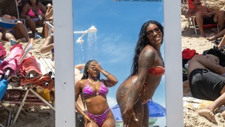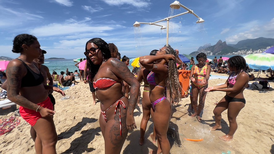Caroline Araujo e a amiga Poliana Vitória,ambas da Pavuna,aproveitam a ducha e se arrumam no espelho na Praia do Arpoador — Foto: Ana Branco/Agência O Globo