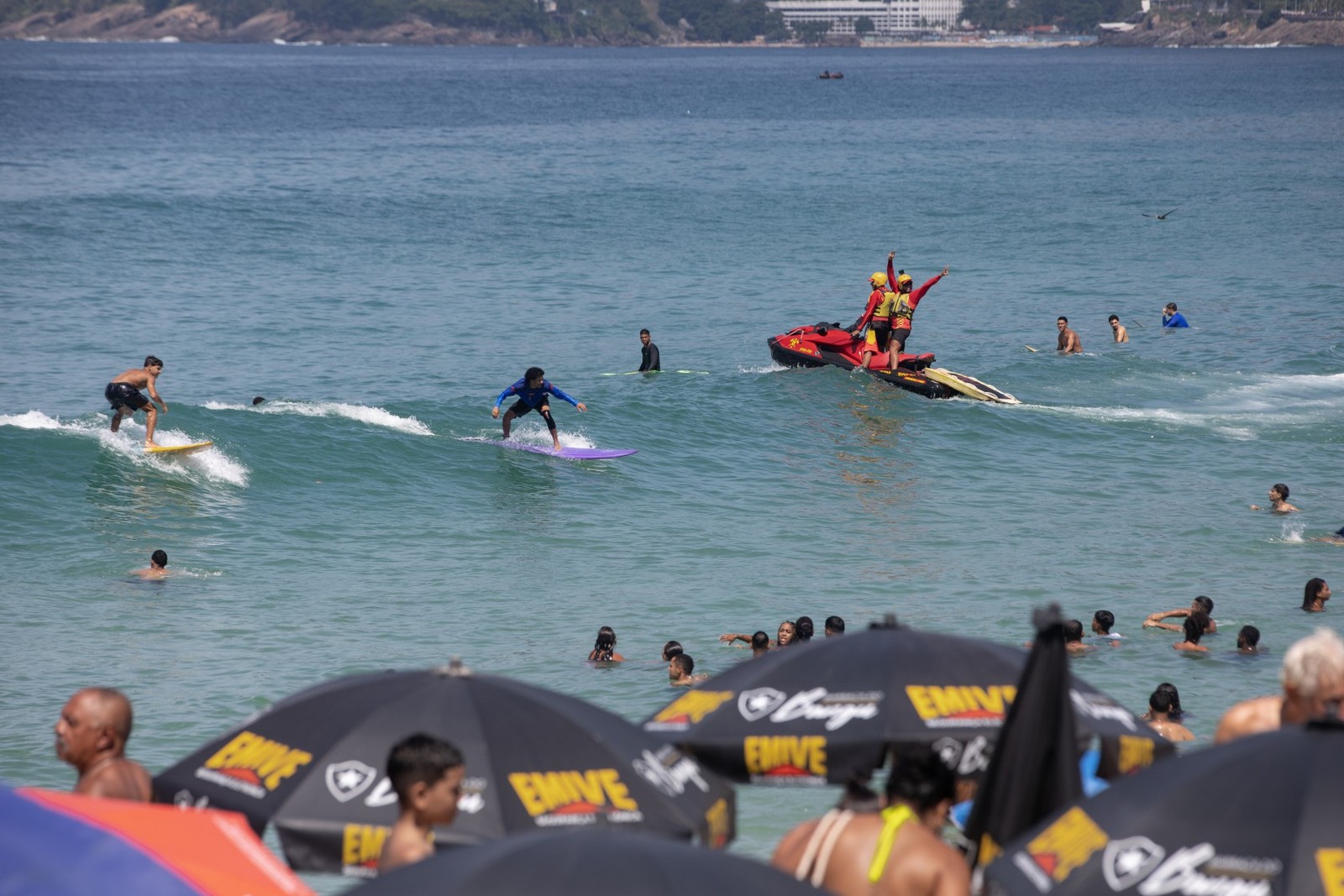 No Arpoador,surfistas e jet-ski se misturam aos banhistas no mar — Foto: Ana Branco/Agência O Globo