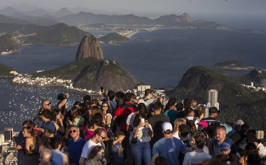 Turistas observam a vista do Rio a partir do Monumento ao Cristo Redentor — Foto: Alexandre Cassiano/28-12-2023