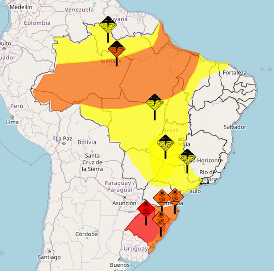 O fenômeno das altas temperaturas está concentrado na região Sul,onde estão espalhados por quatro avisos: "Perigo" e "Grande Perigo". O de maior intensidade caracteriza risco a saúde e é estabelecido quando a temperatura fica 5ºC acima da média por período de três até cinco dias.