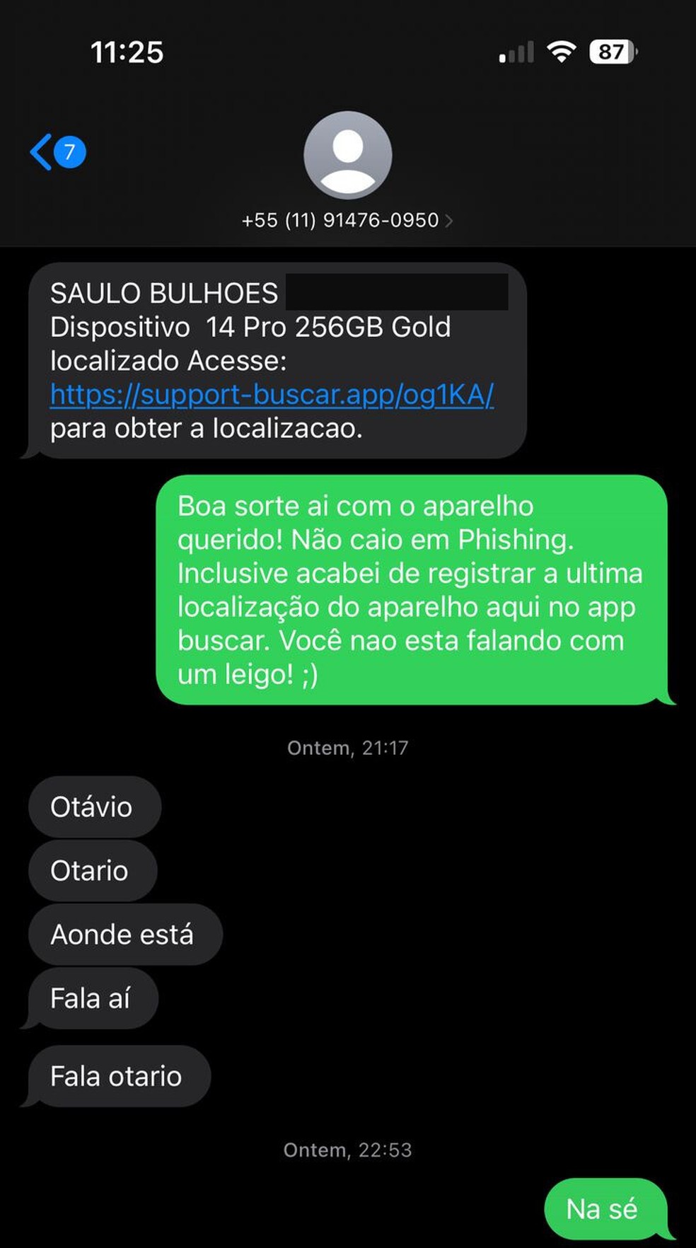 — Se eu clicasse no link,eles provavelmente iam ter acesso à minha senha da Apple. Eu respondi dizendo que sabia onde o celular estava,e eles me chamaram de otário,adotaram um tom quase ameaçador.