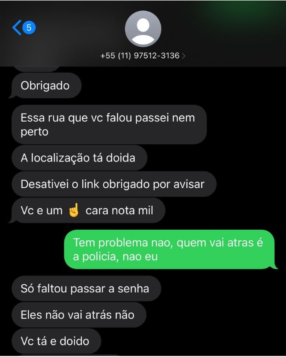No caso de Saulo,o modo “roubo”,disponível nos aparelhos com o sistema iOS,revelou que o celular dele estava na Praça da Sé,em São Paulo. Na noite de segunda,quando já tinha habilitado o número de sua linha em outro aparelho,ele recebeu um SMS dos criminosos,semelhante a uma mensagem automática,na qual havia um link de localização do celular. Para ele,era uma tentativa de golpe: