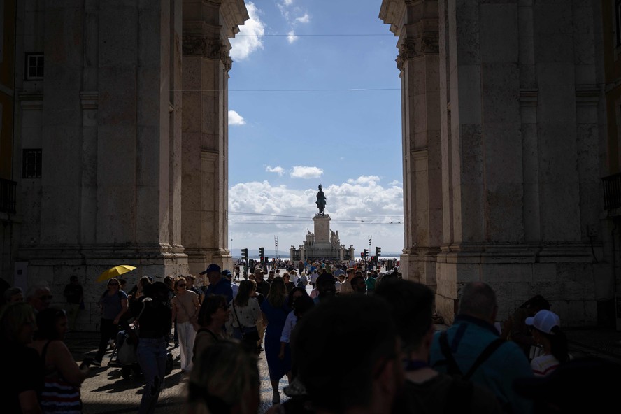 Movimento de pedestres sob o Arco da Rua Augusta,em Lisboa — Foto: Patrícia de Melo Moreira/AFP