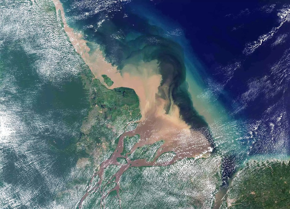 A foz do rio Amazonas,área de prospecção de petróleo offshore visada por empresas de Brasil,Suriname e Guiana — Foto: Landsat/Nasa