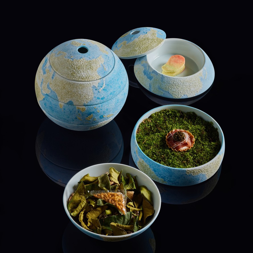 Dono de um bom humor e irreverência ímpares,o chef está à frente de três empreendimentos. O Gaggan e o Ms. Maria & Mr. Singh dividem o mesmo prédio,e em março de 2024,o O Gaggan at Louis Vuitton abriu as portas na LV The Place,loja conceito da marca de luxo no coração de Bangcoc,um “cubo” cheio de interações high tech e bolsas,sacolas,sacolões,todas elas expostas (e o povo comprando) pelos muitos andares. Na cerâmica do restaurante,um globo terrestre se desmembra em muitas partes,cada uma representando uma sensação: doce,ácido,salgado e apimentado. Uma obra de arte.