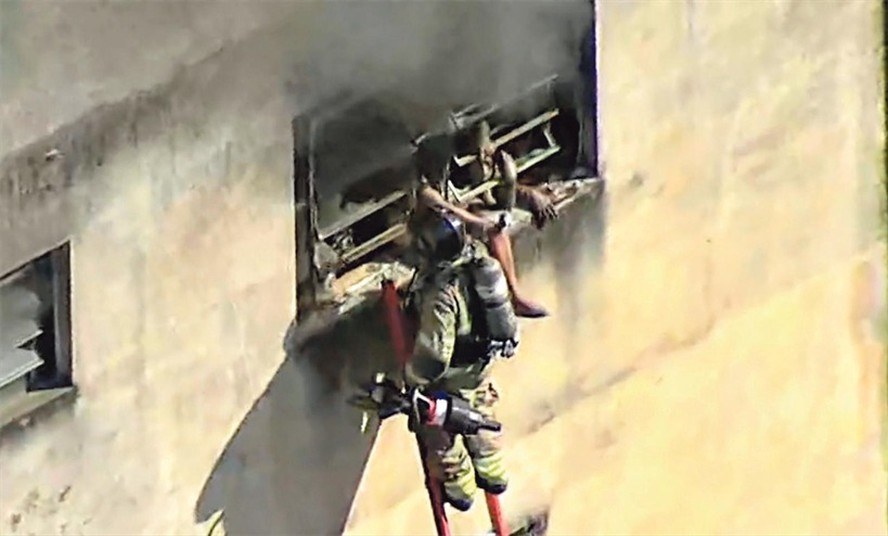 Bombeiro remove estrutura de ferro da janela para resgatar funcionários da fábrica de fantasias de carnaval que pegou fogo na manhã de ontem — Foto: Reprodução