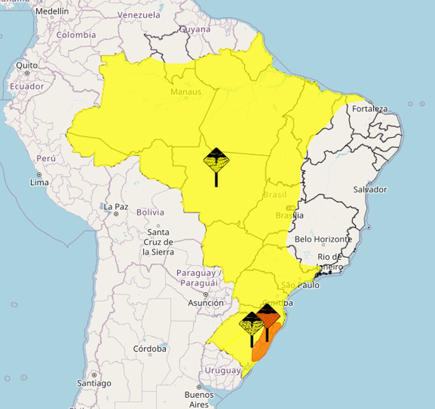 Por fim,o órgão ainda prevê chuvas intensas em parte de todas as regiões do Brasil. Neste caso,o tempo terá chuva de até 50 mm/dia,ventos intensos entre 40 e 60 km/h. Há baixo risco de corte de energia elétrica,queda de galhos de árvores,alagamentos e de descargas elétricas.