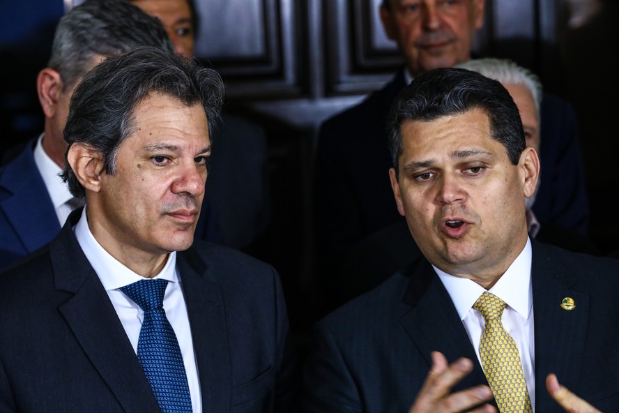 Ministro da Fazenda,Fernando Haddad,e Davi Alcolumbre,presidente do Senado Federal — Foto: Brenno Carvalho / Agência O Globo
