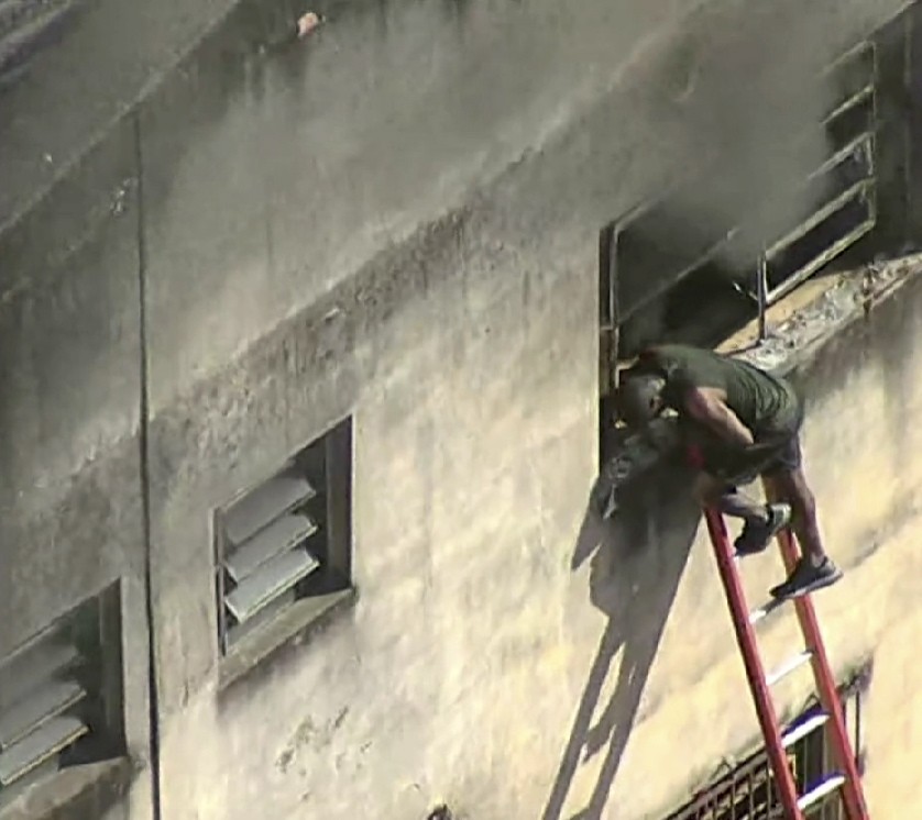 Vítima de incêndio consegue deixar prédio de confecção de roupas em Ramos — Foto: Reprodução TV Globo