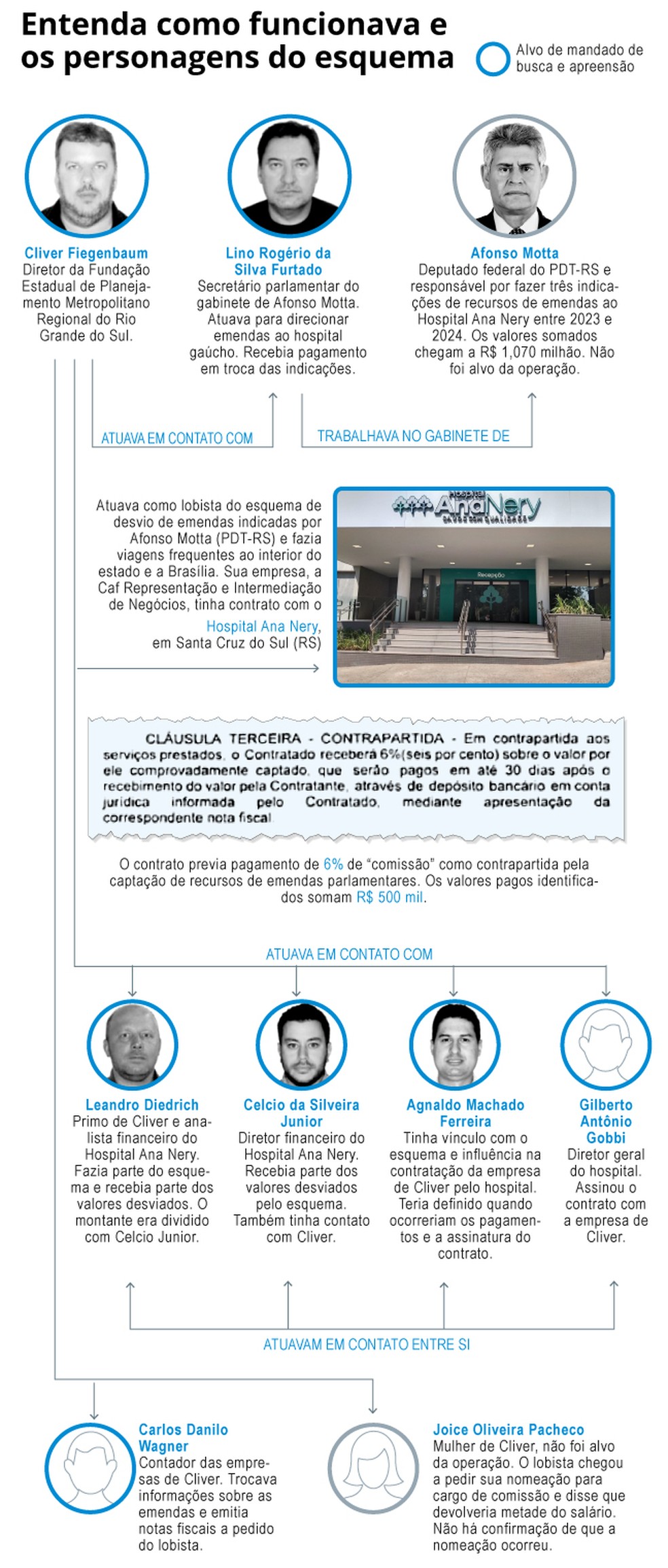 O alvo da PF atuava como captador das emendas em Brasília em troca do pagamento de 6% do valor direcionado para um hospital em Santa Cruz do Sul,no interior do estado. Segundo a corporação,esse tipo de arranjo,formalizado até mesmo em contratos,configura “vantagem indevida”,ou seja,corrupção.