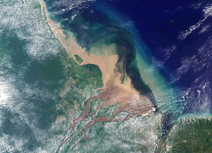 A foz do rio Amazonas,área de prospecção de petróleo offshore visada por empresas de Brasil,Suriname e Guiana — Foto: Landsat/Nasa