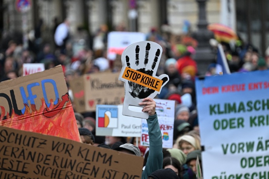 Manifestante segura cartaz com a forma de uma mão onde se lê “Pare o carvão” durante uma “greve pelo clima” convocada por ativistas ambientais do Fridays for Future em fevereiro de 2025 — Foto: RALF HIRSCHBERGER / AFP