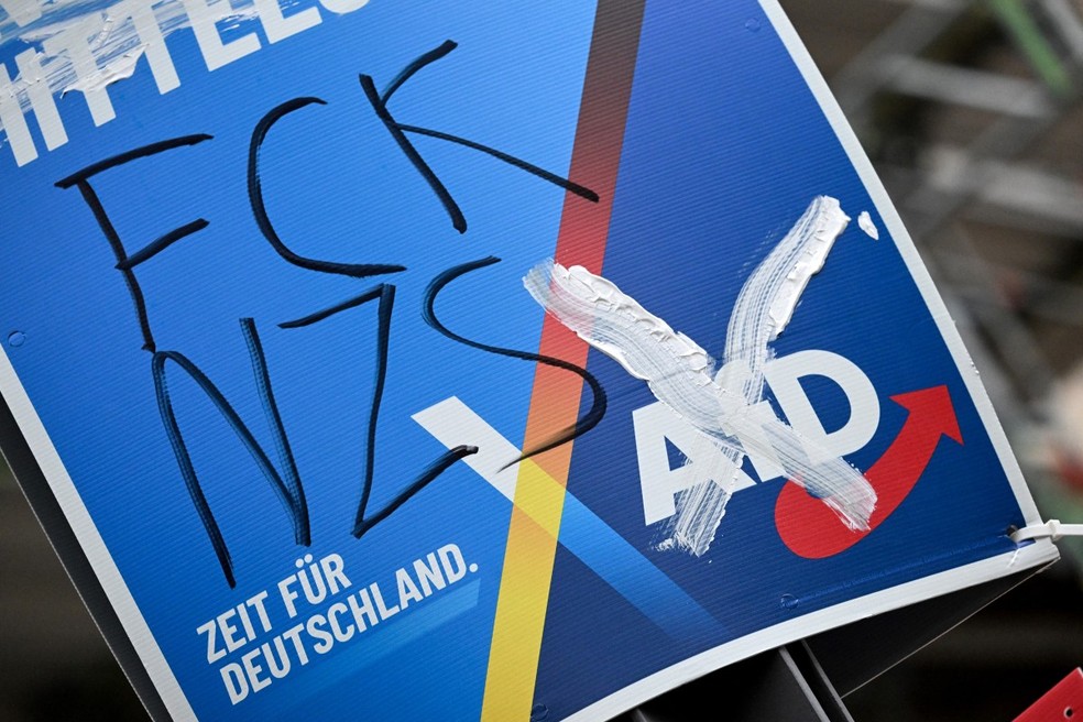 Um pôster desfigurado da campanha eleitoral da Alternativa para a Alemanha (AfD),de extrema-direita — Foto: Kirill KUDRYAVTSEV / AFP