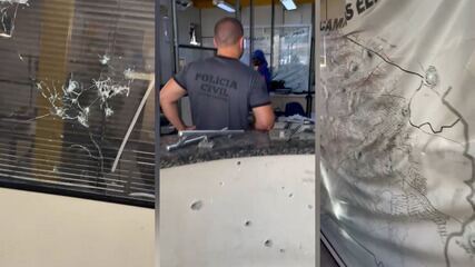 Após ser atacada por 10 homens na noite de sábado,a 60ª DP (Campos Elíseos),em Duque de Caxias,foi isolada para perícia neste domingo. Os agentes trocaram tiro por mais 10 minutos com os criminosos,que organizaram a investida para resgatar o traficante Rodolfo Manhães Viana,o Rato,dono do tráfico na favela Vai Quem Quer. No entanto,ele já havia sido transferido junto a um comparsa. Imagens feitas no interior da delegacia mostram como a repartição ficou destruida após o ataque.