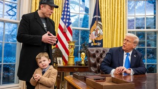 Filho de Elon Musk,X Æ A-Xii com o pai e o presidente Donald Trump no Salão Oval — Foto: Jim WATSON / AFP