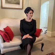 Exposição de trajes da posse presidencial. Michelle posa ao lado do vestido que usou na cerimônia — Foto: Alan Santos/PR