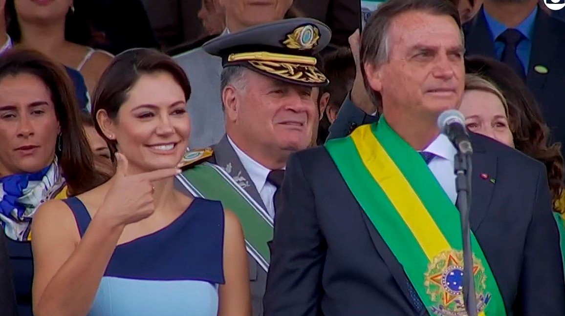 Michelle e Bolsonaro durante desfile do 7 de Setembro — Foto: Reprodução