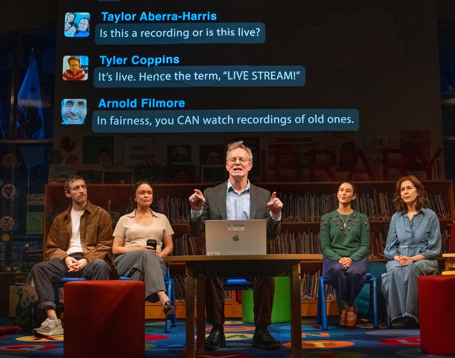 Bill Irwin (no centro) com os atores (a partir da esq.) Amber Gray,Chelsea Yakura-Kurtz and Jessica Hecht na peça 'Eureka Day' — Foto: Sara Krulwich/NYT