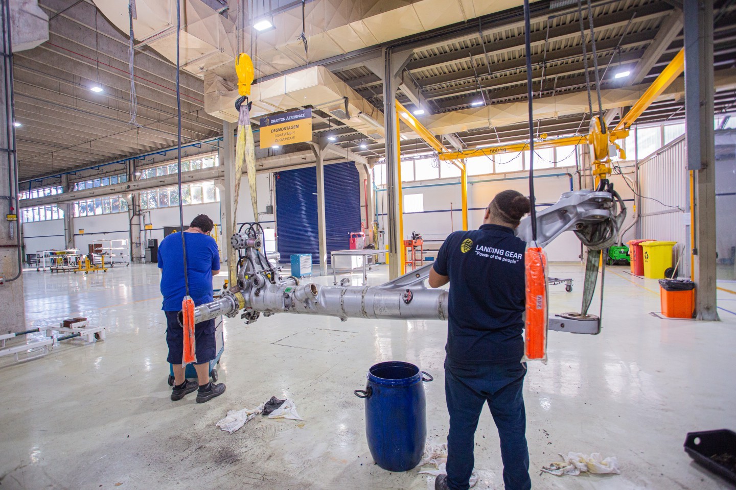 Técnicos inspecionam perna de trem de pouso na oficina da Drayton Aerospace,que ocupará 19 mil metros quadrados no polo do Galeão. Capacidade de reparos mais que triplicará quando atingir o máximo planejado. — Foto: Beatriz Orle/Agência O Globo