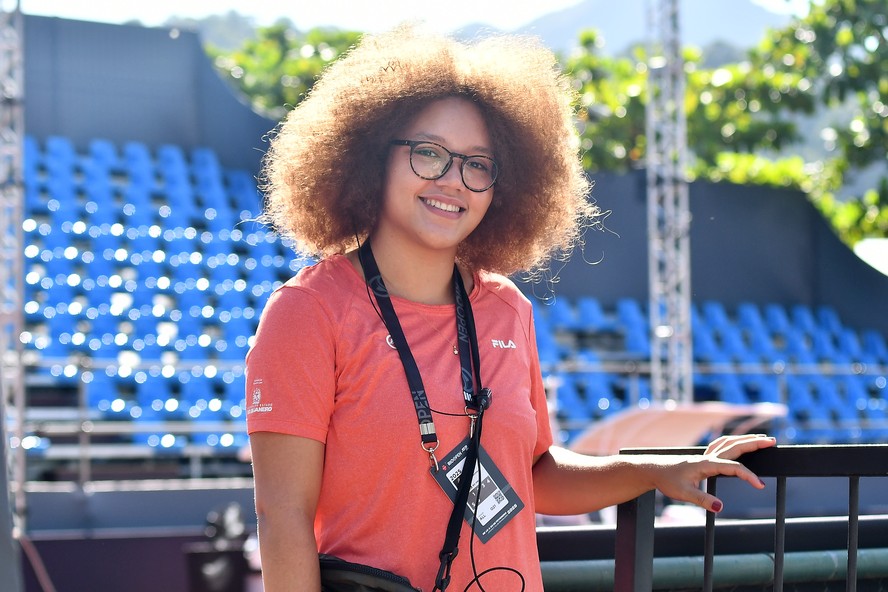 Participante do projeto Tênis na Lagoa,Júlia Constantino,19,atua como voluntária na equipe de marketing do Rio Open — Foto: Deco Pires/Rio Open/Divulgação