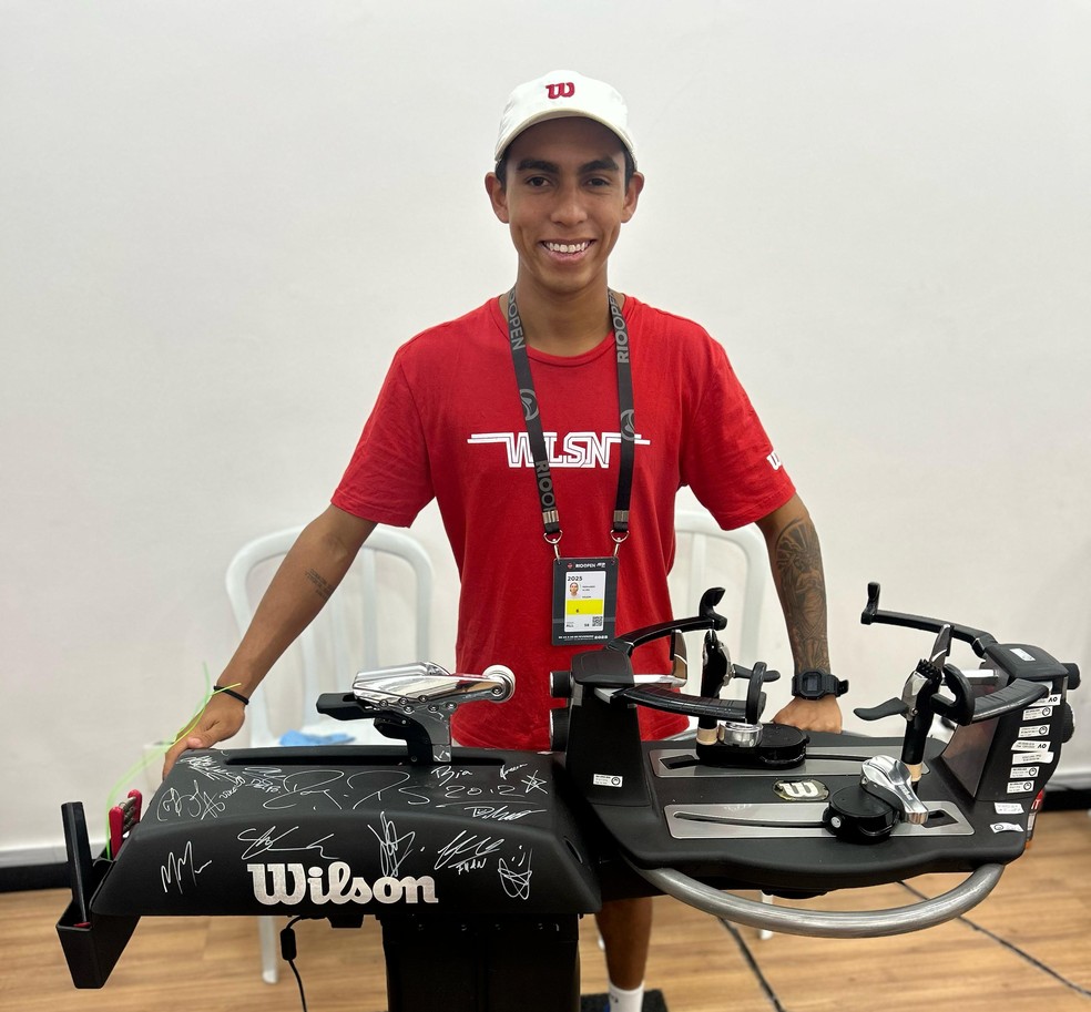 Fernando Alves ajuda no encordoamento de raquetes do Rio Open — Foto: Divulgação