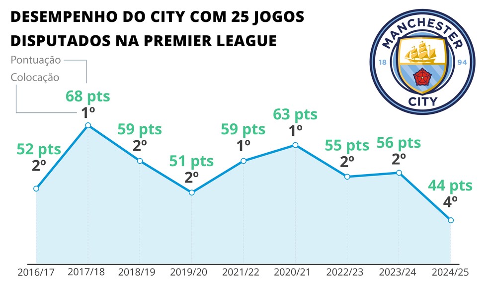 Desempenho do Manchester City na Premier League até a 25ª rodada — Foto: Editoria de Artes