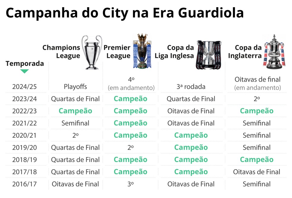 Acostumado a enfileirar troféus nos últimos anos,o Manchester City vive uma temporada atípica sob o comando de Pep Guardiola. A parceria,que está próxima de completar nove temporadas,pode chegar ao mesmo desfecho da primeira delas,em 2016/2017,quando não conquistou um título sequer. A ponto de o próprio treinador espanhol admitir poder estar diante do fim do ciclo vencedor: