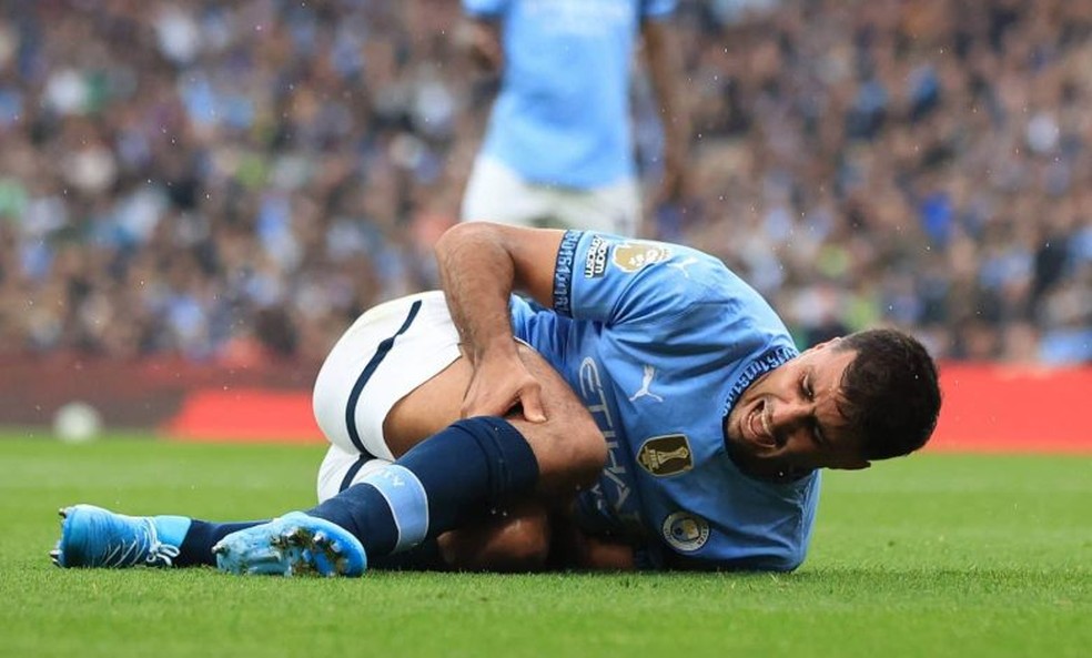 Rodri sofreu grave lesão ligamentar no joelho direito contra o Arsenal — Foto: Imago