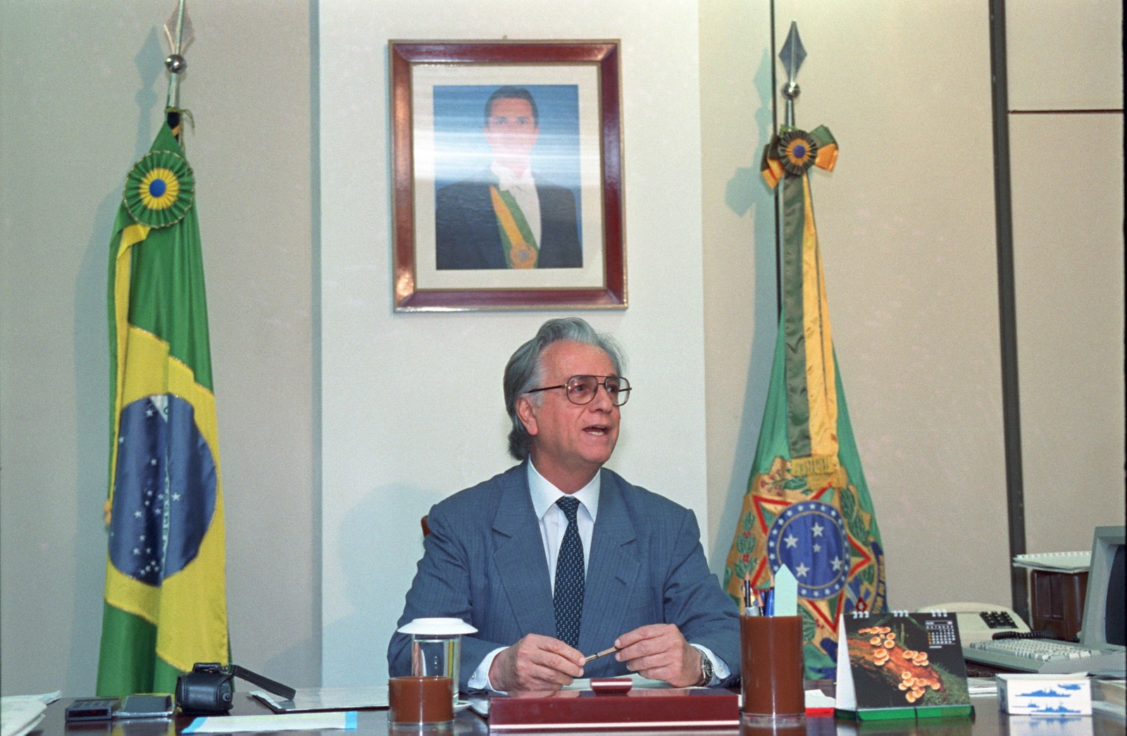 O ex-presidente Itamar Franco tomou posse após o impeachment de Collor. Ao fundo,foto do ex-presidente deposto Fernando Collor de Mello. — Foto: Ricardo Stuckert / Agência O Globo
