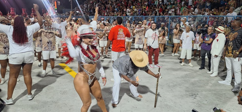 Viviane Araújo,rainha de bateria,também teve um momento de destaque. Ela sambou ao lado do mascote da escola e de um preto velho,encantando a plateia com sua energia e simpatia. A sua performance,cheia de emoção,marcou a avenida e trouxe ainda mais vida ao enredo,reforçando o simbolismo do espetáculo. Além disso,Viviane completou 30 anos desfilando e,com orgulho,deixou um recado para os fãs: ela só vai parar quando decidir.