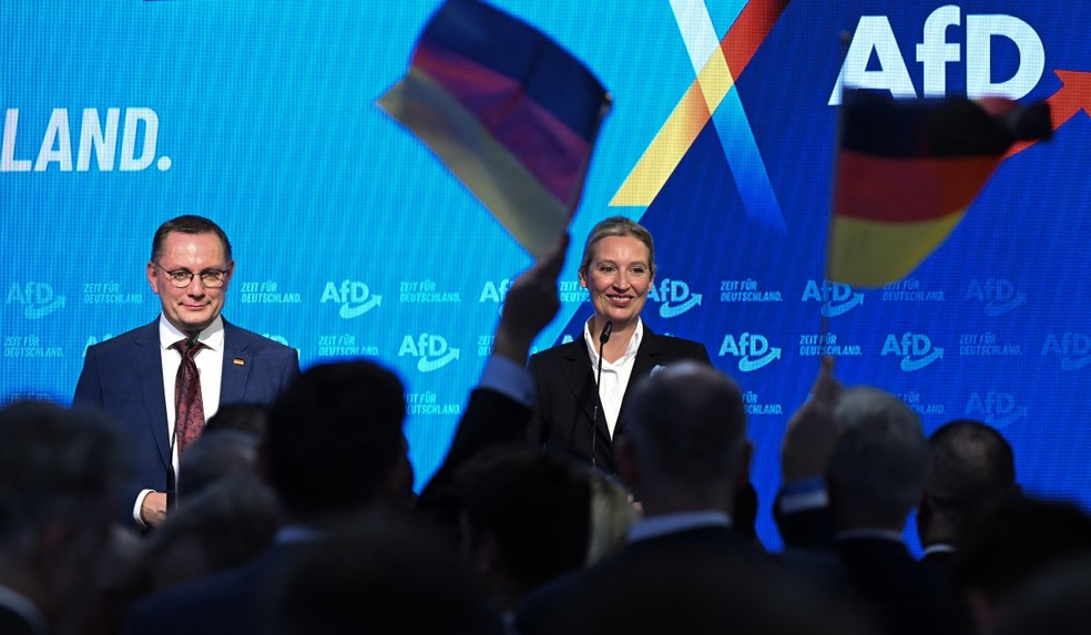 A colíder do partido de extrema-direita AfD e candidata a chanceler Alice Weidel e o colíder do partido Tino Chrupalla comemoram com membros do partido durante as eleições em Berlim — Foto: RALF HIRSCHBERGER / AFP