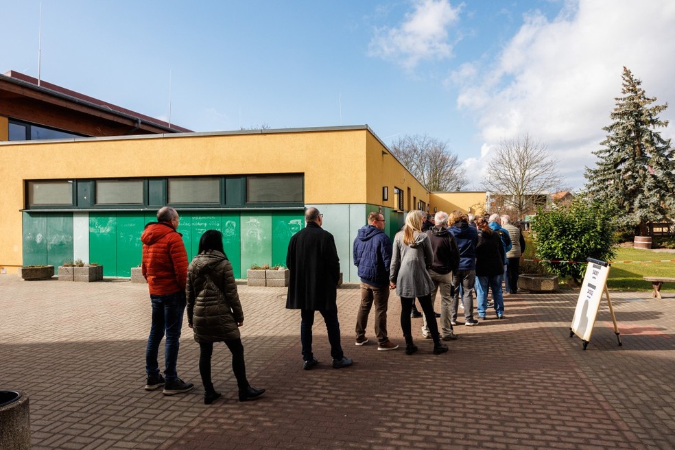 Eleitores fazem fila do lado de fora de duas seções eleitorais para as eleições no leste da Alemanha — Foto: JENS SCHLUETER / AFP