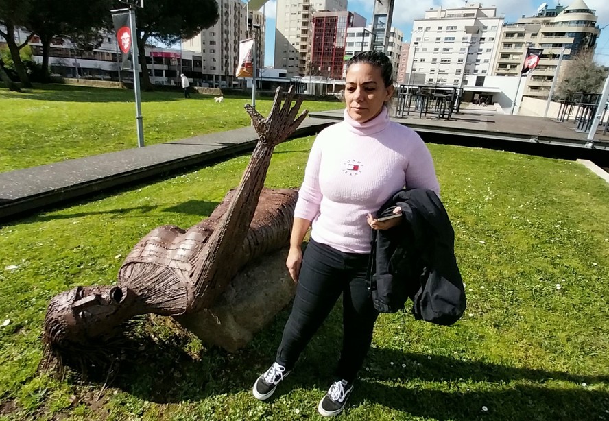 Érika junto à estátua O Grito II,de Idílio Fontes,na Maia,em Portugal — Foto: Gian Amato/Portugal Giro/O Globo