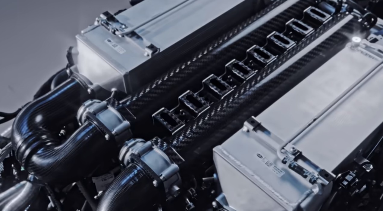 Motor W16 de 8 litros,quad-turbo e 1.600 cavalos de potência,é o mesmo utilizado pelo Bugatti Chiron,mas apresenta diferentes modificações para melhorar a performance do Bolide — Foto: Reprodução / Youtube