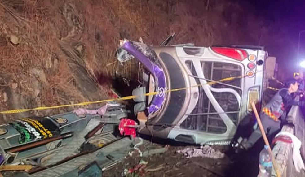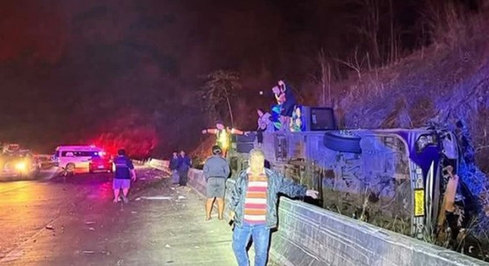 Polícia na Tailândia suspeita que ônibus perdeu os freios na descida da serra e capotou — Foto: Reprodução / redes sociais