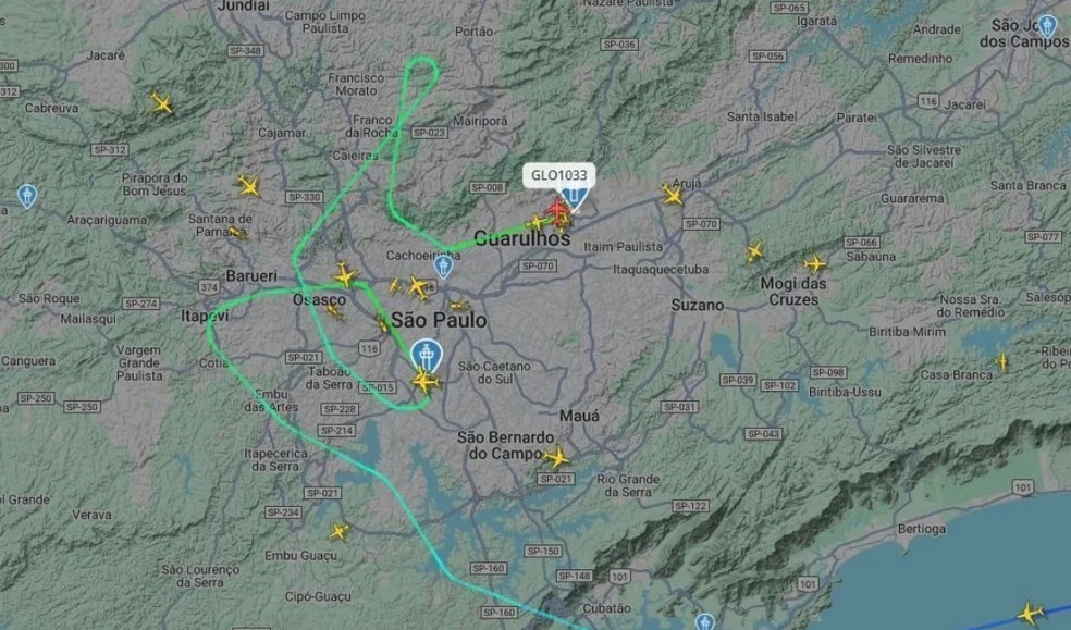 Trajetória de voo que declarou emergência e desviou para Guarulhos — Foto: Reprodução/FlightRadar24