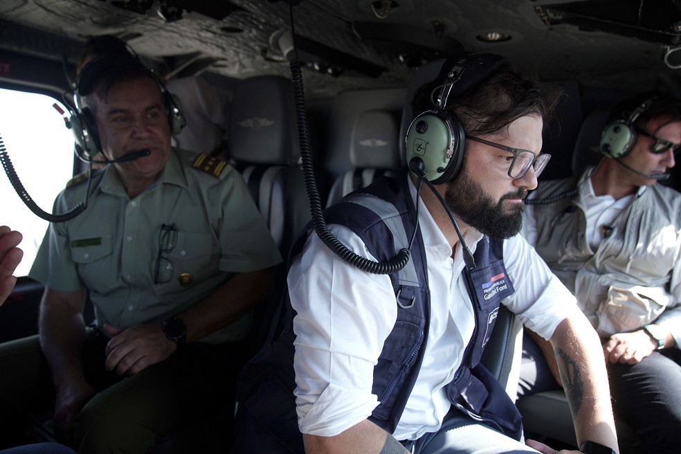 Presidente do Chile,Gabriel Boric sobrevoa a capital,durante apagão que atingiu grande parte do país — Foto: Presidência do Chile/AFP