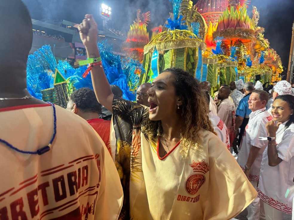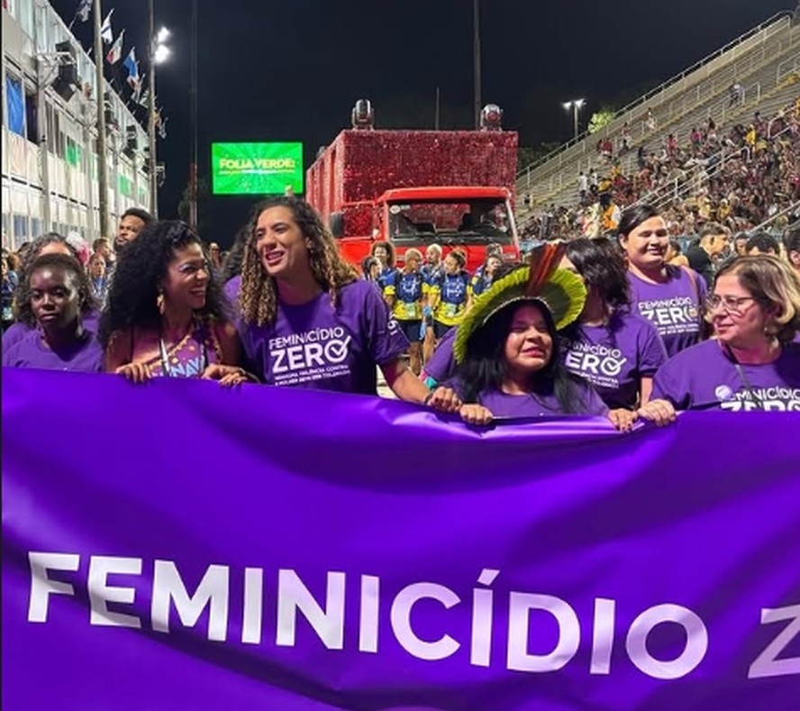 Vestidas de roxo,a ministra das Mulheres,a ministra da Igualdade Racial,Anielle Franco,e a secretária municipal das Mulheres e Cuidados,Joyce Trindade,realizaram uma manifestação no meio da Sapucaí,segurando uma faixa com a frase "Nenhuma violência contra a mulher deve ser tolerada". A ação foi promovida pelo Ministério das Mulheres,do Governo Federal,com o apoio do Rio Carnaval e da Liga Independente das Escolas de Samba do Rio de Janeiro (LIESA).