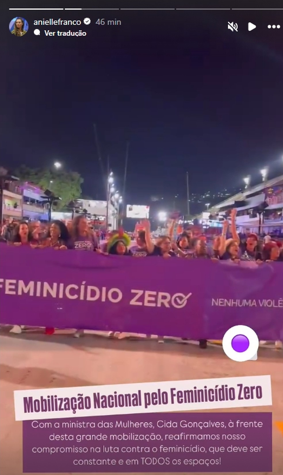 Em seu perfil do Instagram,Anielle compartilhou momentos do ato e comentou "É o Governo Federal declarando: Feminicídio zero,na Sapucaí lotada! A adesão das escolas de samba à mobilização é um importante marco. Juntas somamos forças pela segurança e proteção de todas as mulheres".