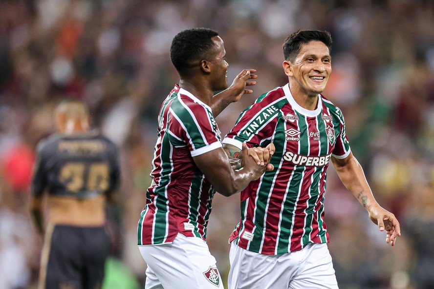 Cano e Arias comemoram o gol que fechou a goleada do Fluminense — Foto: Lucas Merçon/Fluminense