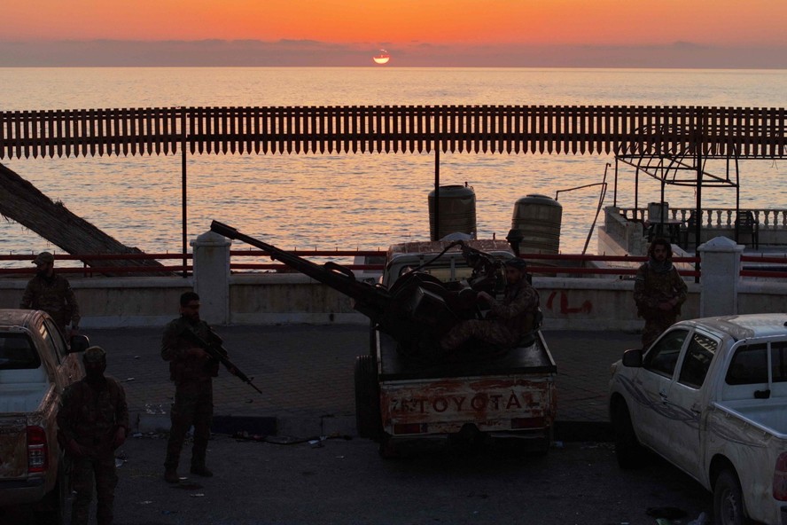 Forças de segurança do governo da Síria montam guarda na província de Latakia — Foto: Omar HAJ KADOUR / AFP/10-03-2025