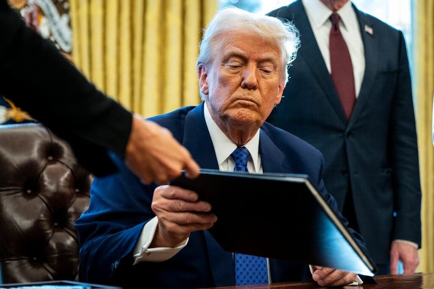 O presidente dos EUA,Donald Trump,assinando decretos no Salão Oval da Casa Branca — Foto: Haiyun Jiang / The New York Times