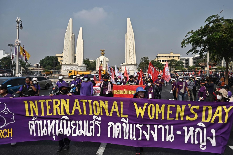 Membros de sindicatos,empresas estatais e ativistas dos direitos das mulheres em marcha pelo Dia Internacional da Mulher,em 2023,em Bangkok,na Tailândia — Foto: Lillian Suwanrumpha / AFP