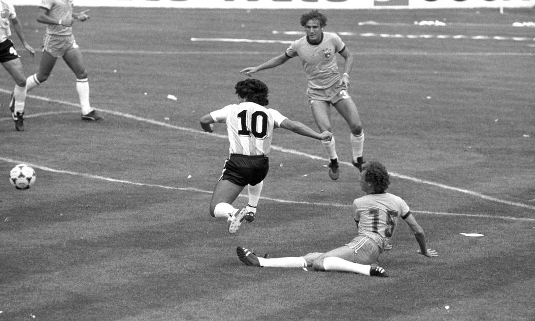 Maradona tenta passar pelo volante brasileiro Falcão na derrota de 3 a 1 para o Brasil,no Estádio Sarriá,em Barcelona — Foto: Erno Schneider/Agência O Globo
