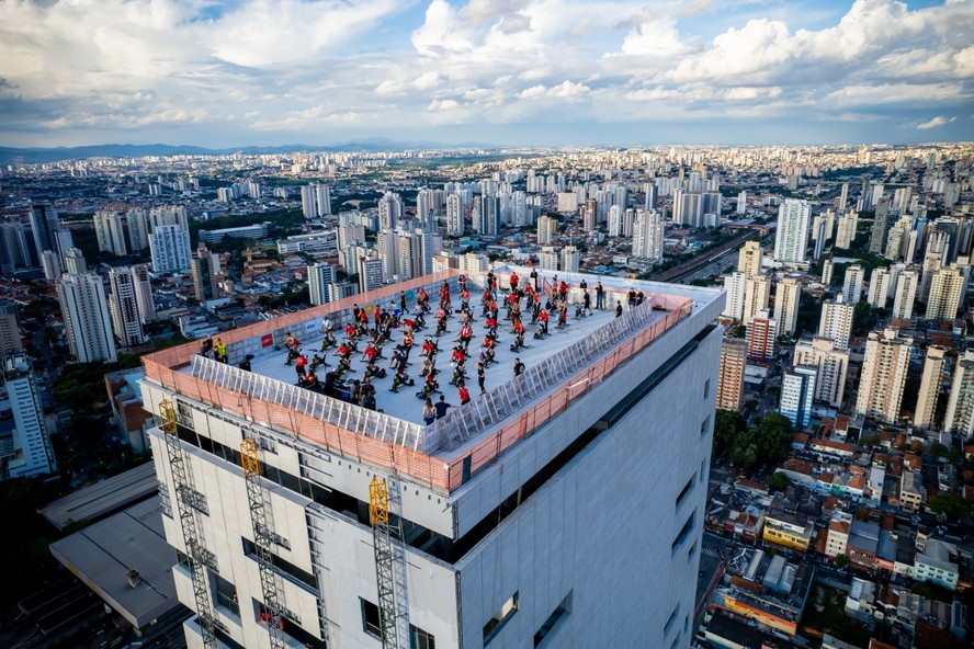 As aulas com vista panorâmica para a cidade são adotadas em eventos corporativos. Uma empresa de telefonia com sede na região da Berrini paralisou as atividades do heliponto do edifício para o spinning com o sklyline paulistano.