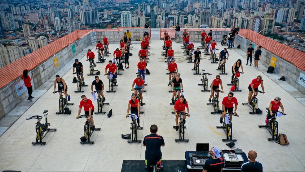 É uma aula de spinning típica: pedala-se de pé,sentado,simulando flexões ou no ritmo do funk,samba e rock dos anos 1980. A excentricidade fica por conta do local e do visual: do alto de helipontos e de terraços de prédios da capital paulista,fileiras simétricas de bicicletas por vezes bloqueiam temporariamente os pousos e decolagens de helicópteros. Com duração de cerca de 50 minutos,ingressos na casa dos R$ 200 e até fogos de artifício,as aulas de “spinning nas alturas” ganharam o topo de São Paulo.