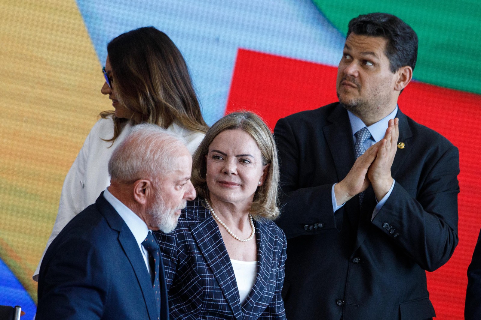 Lula e Gleisi conversam,com Janja e Alcolumbre ao fundo — Foto: Brenno Carvalho