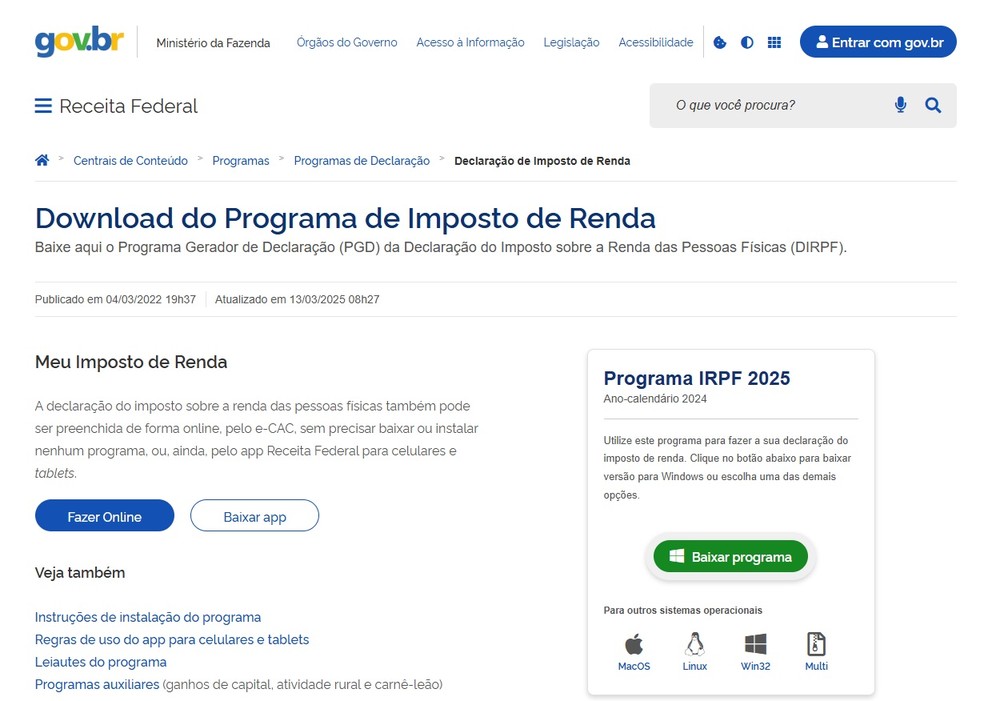 Você será redirecionado à página de download do programa IRPF 2025. Nesta página,também é possível acessar o ambiente de declaração pelo próprio navegador. Para baixar o programa no seu computador,acesse a caixa à direita e clique na opção que se encaixa com o sistema operacional do seu aparelho.