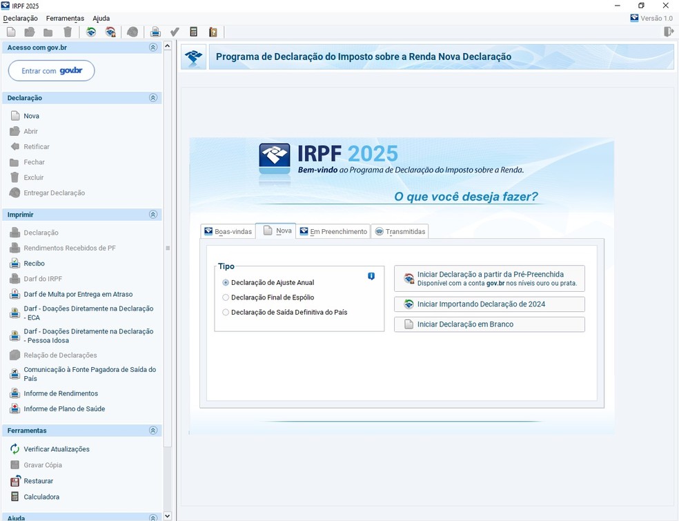 Caso essa seja sua primeira declaração,opte por iniciar uma declaração nova clicando em “Nova”. A partir daí,clique em “Declaração de Ajuste Anual”. Ao lado,escolha se deseja 1. iniciar uma declaração a partir da Pré-preenchida (que será totalmente disponibilizada a partir de 1º de abril); 2.iniciar importando dados da declaração de 2024 ou 3.Iniciar uma declaração em branco